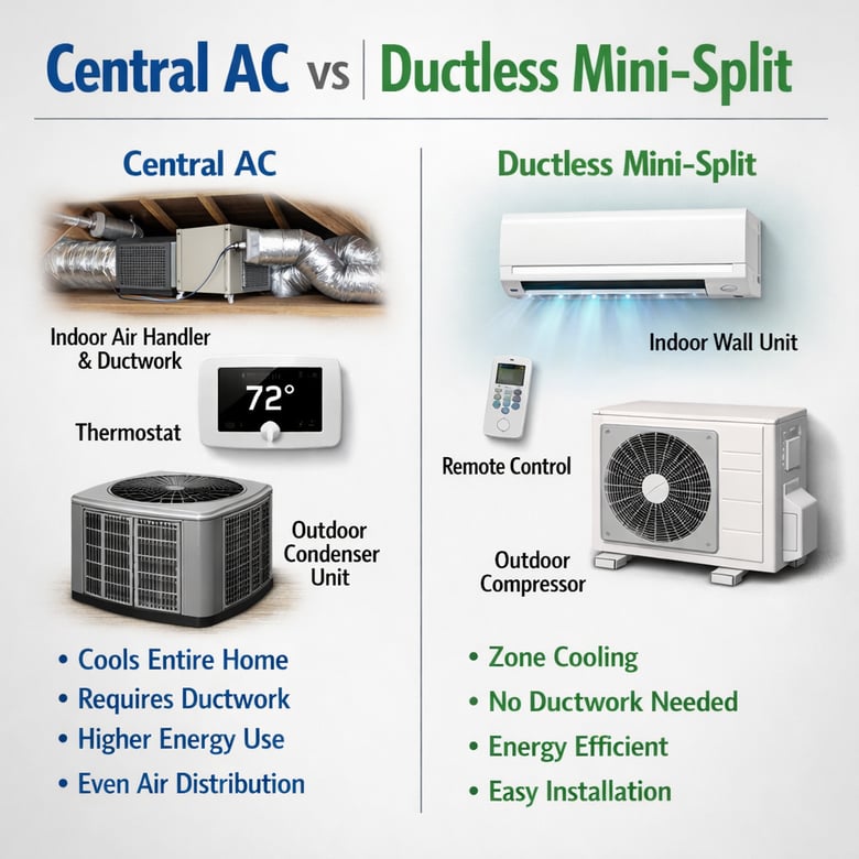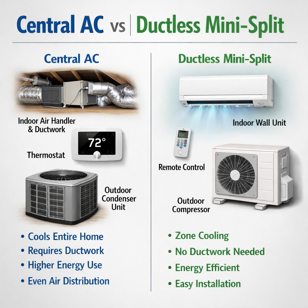 Central AC cools a home through ductwork using one main system, while ductless mini-split systems use individual indoor units to cool specific rooms without ducts. Central AC works best in homes with existing, well-sealed ductwork and consistent layouts. Ductless systems are better for older homes, additions, or spaces that need room-by-room control and stronger humidity management.