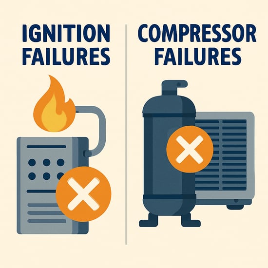 These are system-stopping HVAC failures, not comfort inconveniences. When ignition or compressor problems occur, heating or cooling usually stops entirely.