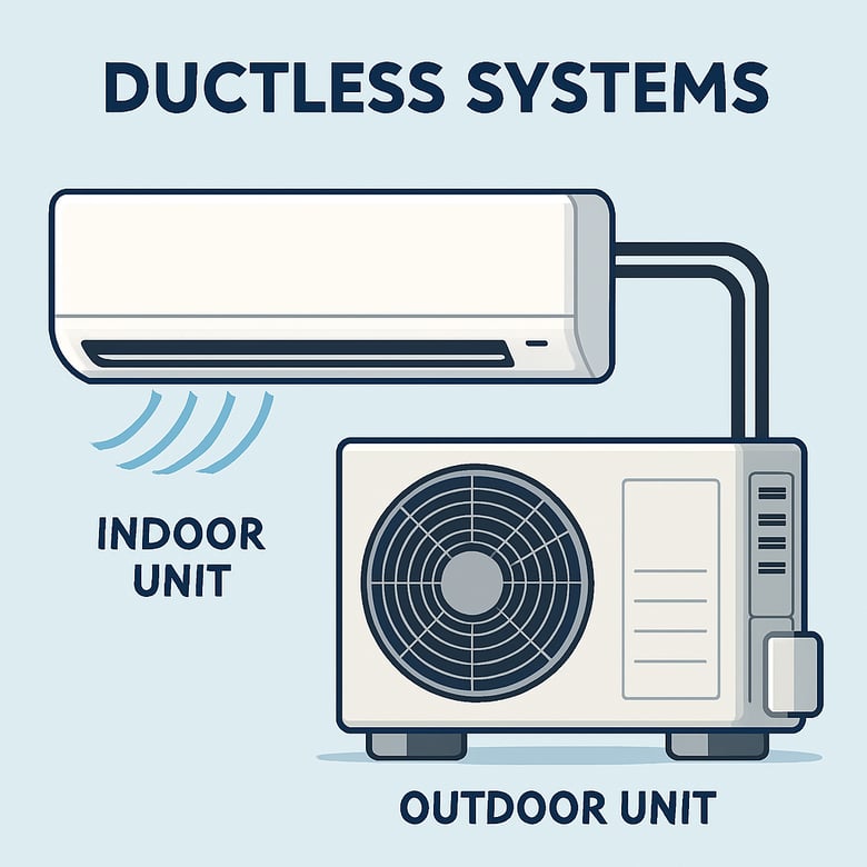 Ductless systems use an outdoor unit connected to one or more indoor units mounted on walls or ceilings. Each indoor unit conditions its own space, and no ductwork is required.
