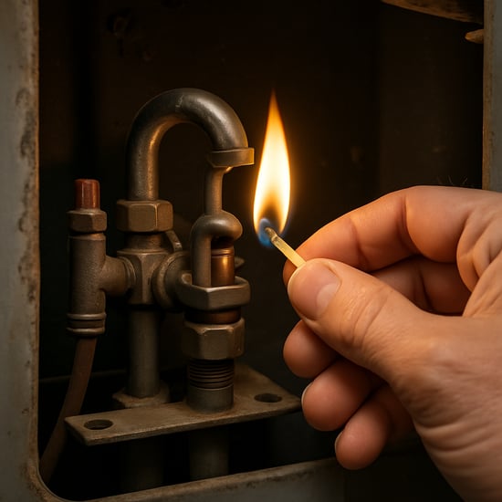 To relight your Brilliant water heater pilot, turn the gas knob OFF for 10 minutes, then switch to PILOT. Hold it down and click the igniter until a steady blue flame appears. Keep holding for 30–60 seconds, then turn to ON. If it won’t stay lit, drafts from the Ohio River, corrosion, or sediment buildup could be the problem — never relight if you smell gas.